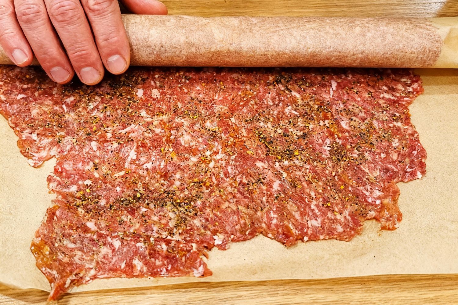 - Oberes Backpapier abziehen und die Fleischplatte längs in vier Streifen schneiden.