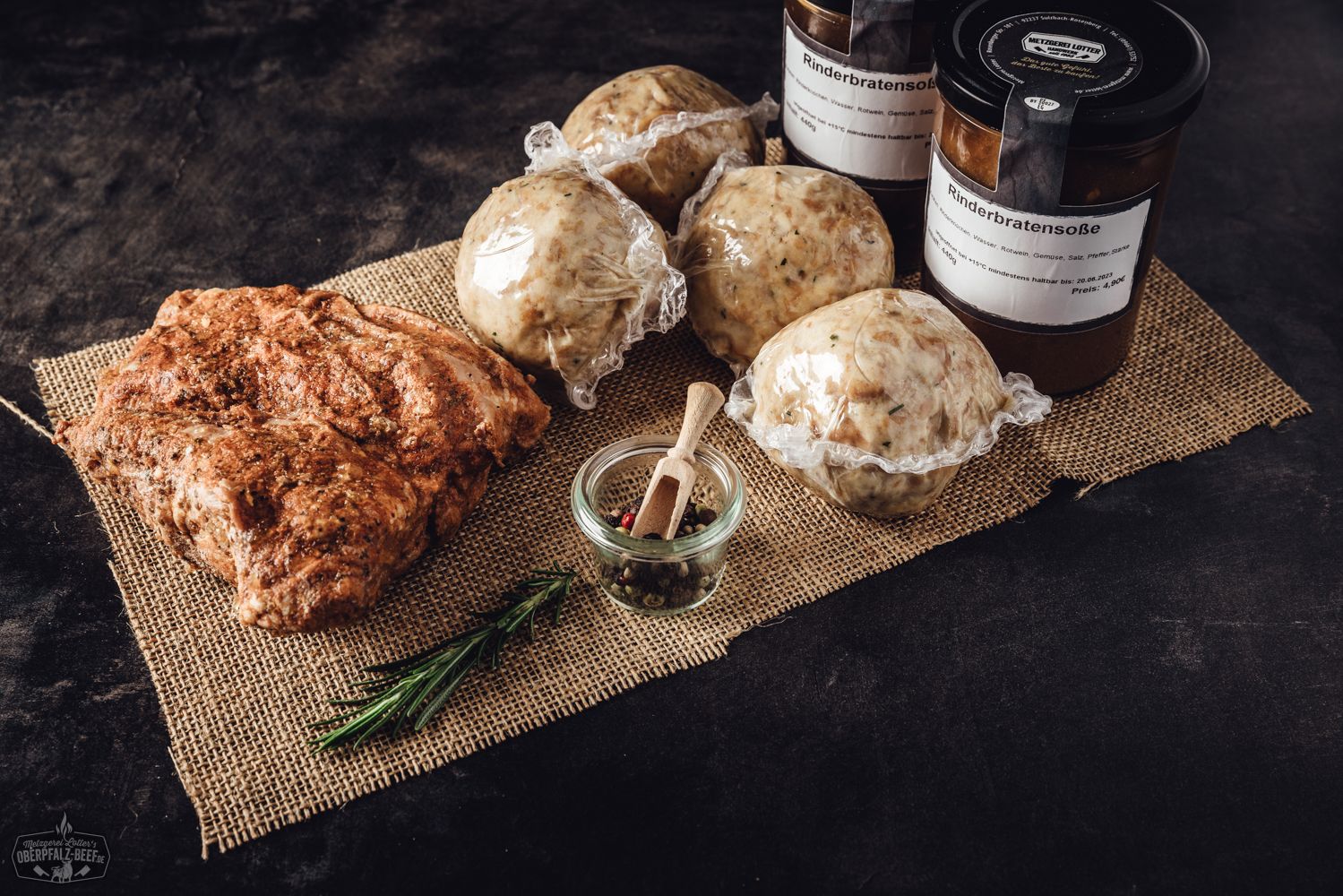 Der Braten wird bereits schonend Sous Vide gegart, sodass er zart bleibt, gleichmäßig durchgart und beim Aufwärmen nicht austrocknet. In Kombination mit handgemachten Knödeln und einer kräftigen Rinderbratensoße entsteht ein rundes Gericht, das sich ideal für Sonntage, Festtage oder als unkompliziertes Familienessen eignet.