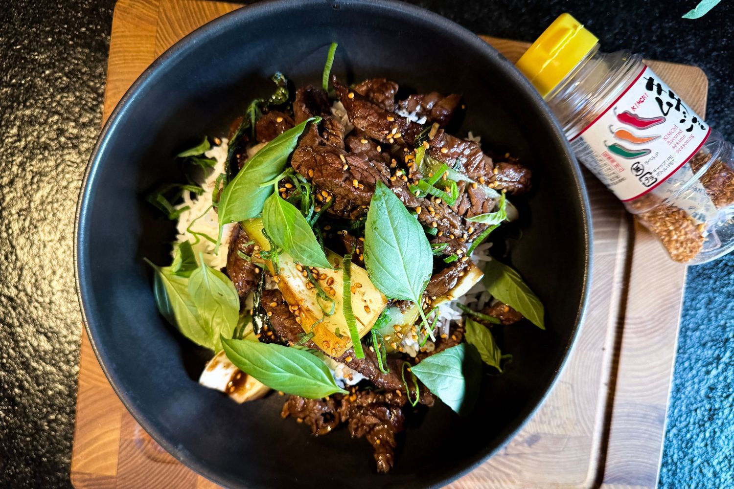 Die Intensität dieses Thai-Basil-Flanksteaks entsteht durch die Kombination aus hochwertigem Flanksteak und einer klassischen thailändischen Marinade, die das Fleisch besonders zart macht. Durch die Mischung aus Sojasauce, etwas Wasser und Stärke wird das Steak sanft velvetted, eine Technik der asiatischen Küche, bei der Fleisch seine Saftigkeit und Struktur behält. Beim scharfen Anbraten im Wok entstehen kräftige Röstaromen, die später mit der süß-würzigen Sauce verschmelzen. Das frisch hinzugefügte Thai-Basilikum verleiht dem Gericht seinen charakteristischen, leicht anisartigen Duft und hebt das gesamte Geschmacksprofil auf ein authentisches thailändisches Niveau.